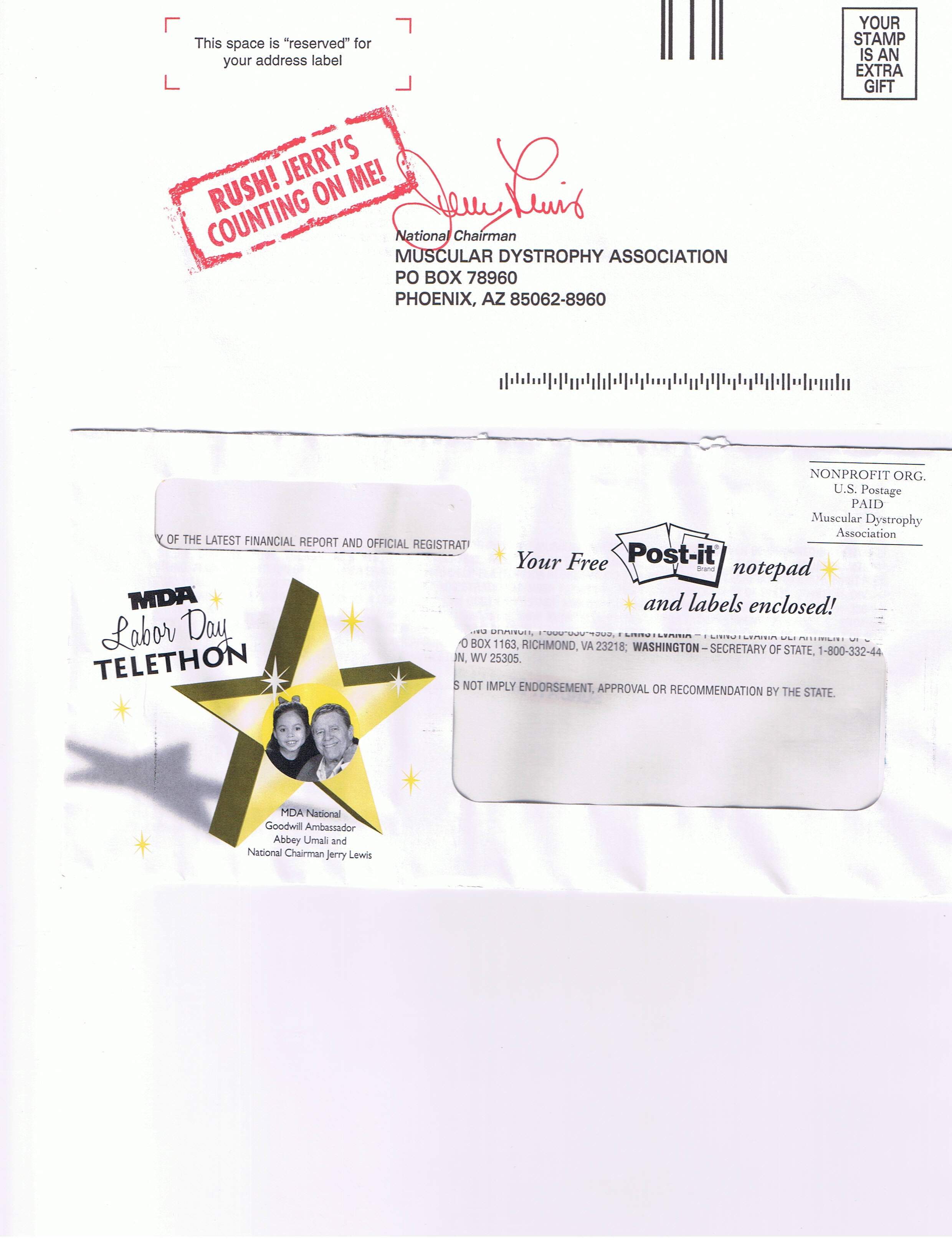 But wait! Comes the mail, and MDA is still sending out come-ons using Lewis’s name and likeness. Holy moley. Their solicitation envelope has a picture of Jerry–captioned as National Chairman–and MDA National Goodwill Ambassador Abbey Umali.