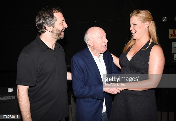 So holy moley–Norman Lloyd has a nice recurring part in Judd Apatow’s “Trainwreck,” a smash comedy that opens Friday. This is the Amy Schumer movie in which the female comic plays a young woman who drinks heavily, smokes everything, sleeps with everyone– until she meets Bill Hader, playing a sports doctor. Amy’s dad, played by Colin Quinn, lives in an assisted living facility. His pal is played by Lloyd, the oldest actor working anywhere I would guess.