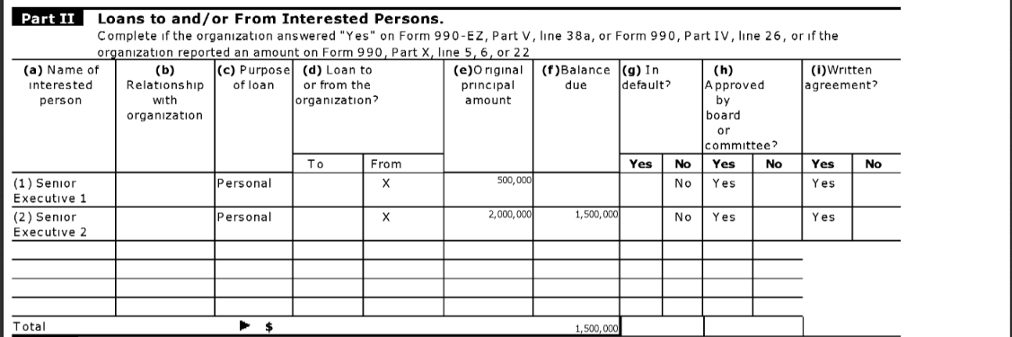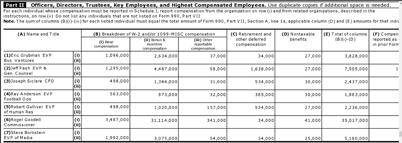 According to the NFL’s Form 990 filed for 2014, the organization made huge personal loans to two different senior executives in 2013. One was for $2 million. The other was for $500,000, which looks like it was repaid. According to the form, a quarter of the $2 million loan has been paid back. Outstanding still is $1.5 million.
