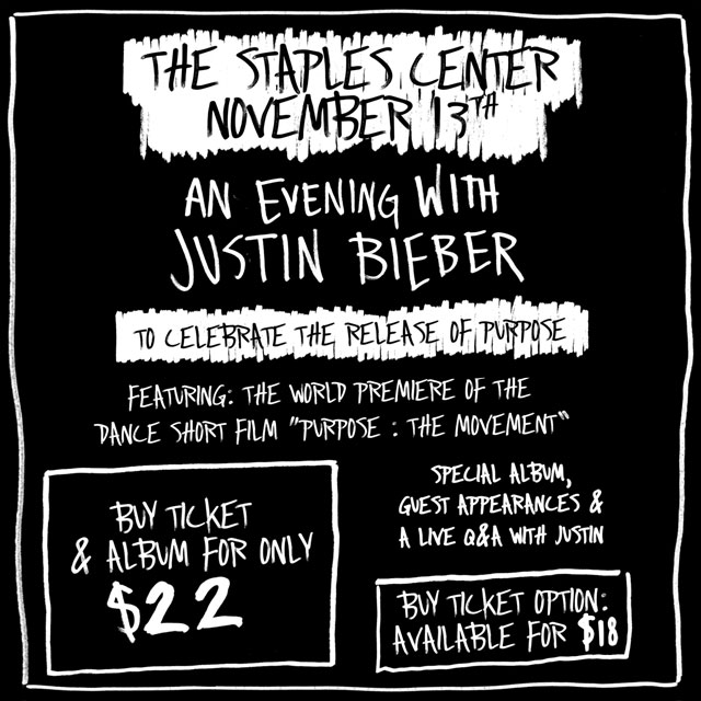 To wit: Tickets for “An Evening With Justin Bieber” will be nominally priced at $22.00, and each will include admission plus a copy of PURPOSE. TICKETS AVAILABLE NOW FOR 9:30 p.m. (PST). An event-only ticket can be purchased for just $18.00.