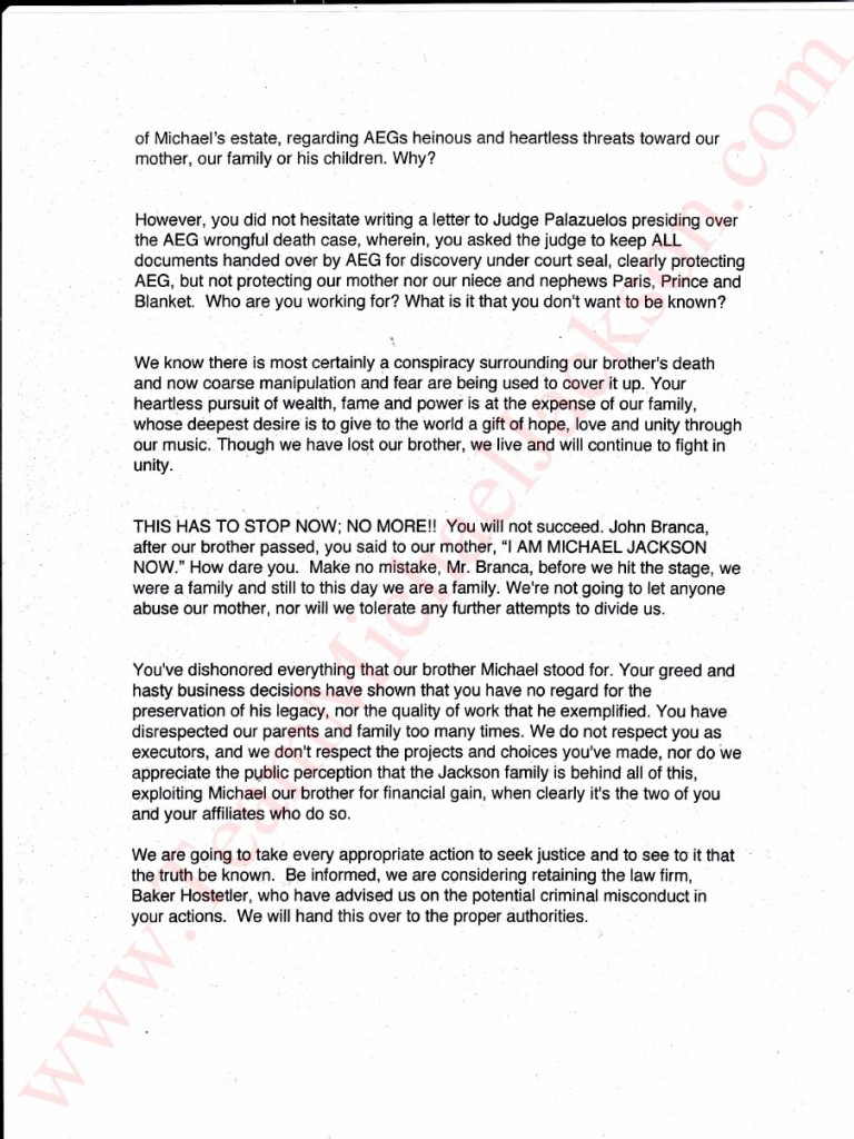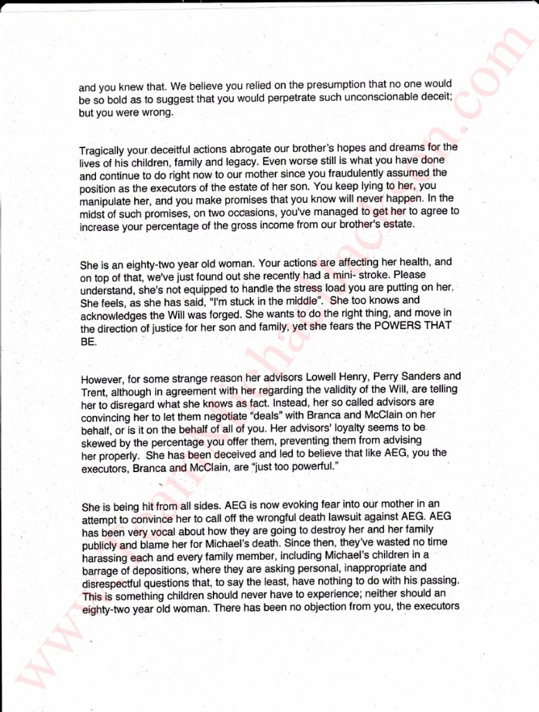 If the letter is real, and truly signed by all these people, it’s delusional at best. The Jacksons are no doubt sorely needing money and this is their last shot at trying to overturn the will. But as the estate’s response points out, the will was approved three years ago, Branca and McClain were certified as the executors, and they’ve carried out their duties. They’ve made a lot of money for Michael’s kids.