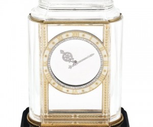 Among the items: A Cartier “Mystery” clock that fetched $515,000. Description: “8 day mechanical movement, the rectangular rock crystal case with rounded pediment outlined in gold bead decoration, enclosing a white enamel chapter ring with gold Roman numerals spaced by gold florets, the inner rim set continuously with rose-cut diamonds, with rose-cut diamond-set hands, set within a white enamel frame applied with a gold laurel leaf motif, edged completely
