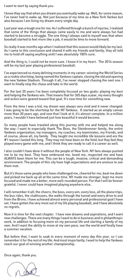 Derek Jeter: Say it ain’t so! The great Yankee shortstop will turn 40 in June. And in September, he will retire from playing baseball. This will also be his 20th season with the Yankees. Amazing. The Yankees are already suffering. This won’t help anything. Jeter missed most of last season because of injuries. Let’s cross our fingers he has a healthy final run. He posted this on Facebook: