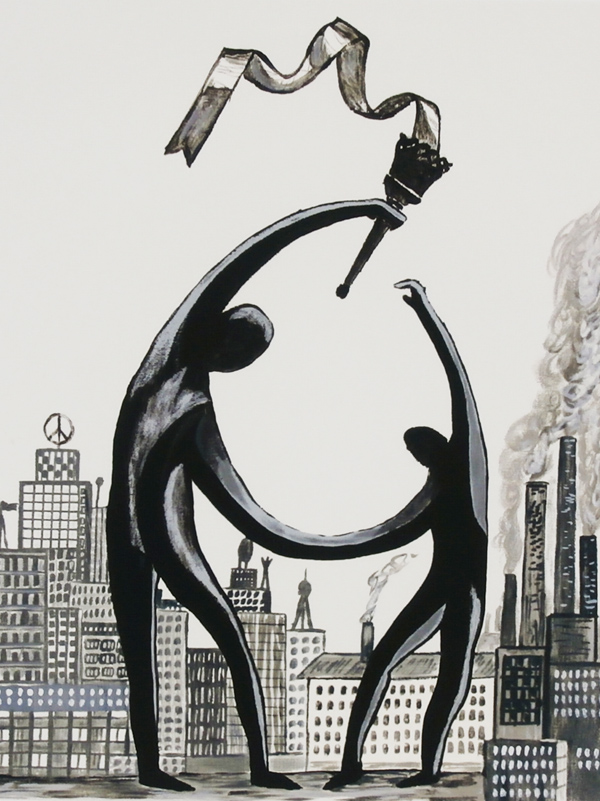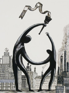 The drawing, lot 173, is called “Inner City Games.” The description: “INNER CITY GAMES, color lithograph, signed in pencil, from the numbered edition 100, image 18 x 14”, full margins, with portfolio case and text, a few speckles in margins, otherwise in good condition. $100/300″
