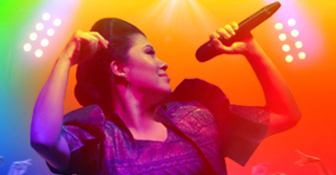 No, it’s not “Tony and Tina’s Wedding.” The audience is a character. Parts of the stage move so that the audience, mostly standing (there are some seats) flows with the sung-through show. We are spectators as Imelda meets Ferdinand after dating Benigno Aquino. She marries the Phillippine dictator and they become drunk with power. The audience– us — are the Filipinos who witness this trajectory.