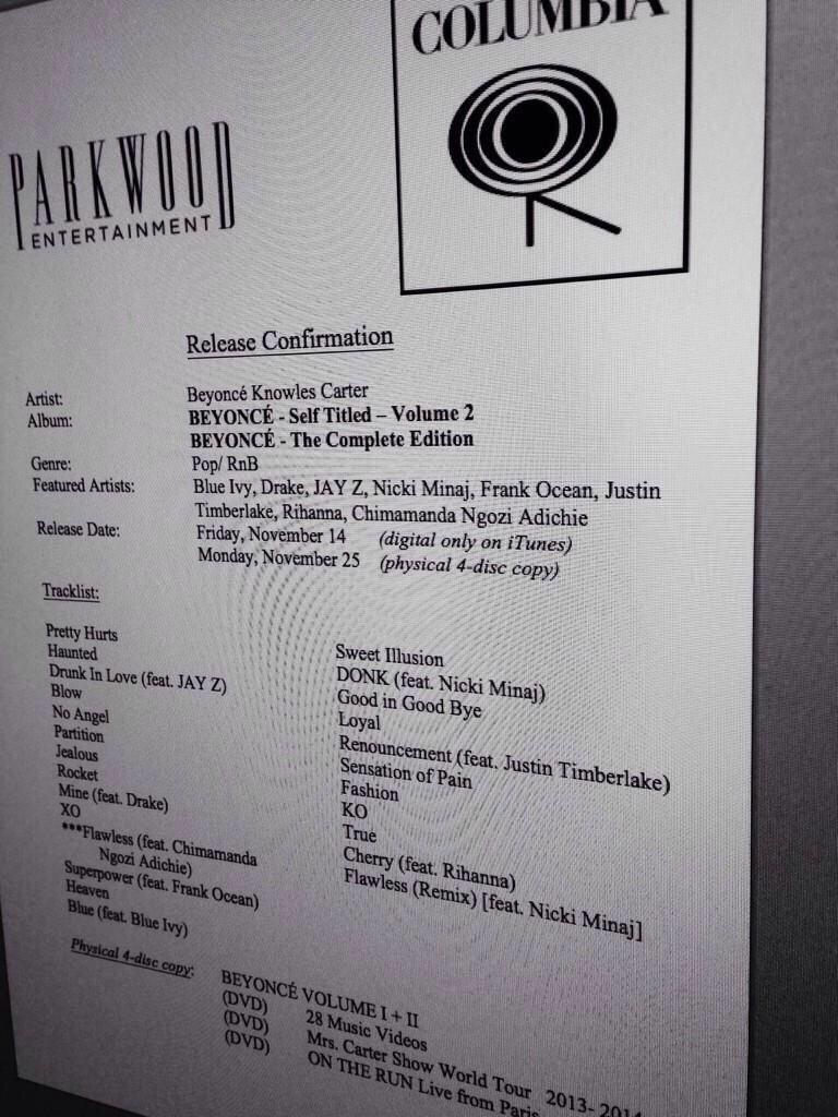 UPDATE: Sony is releasing the Platinum edition of last year’s Beyonce album. It has two new songs, but none of the nonsense that was spread in the faked photo. CNN and thousands of outlets fell for a hoax that included 11 non existent songs. The actual two new songs are called “7/11” and “Ring Off.” Neither of them was listed on the fake memo.
