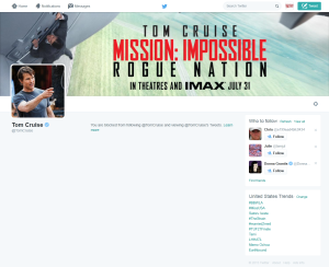 Who knew? So honored. Flattered, even. In the name of Xenu, I am thrilled to report that @Showbiz411 has been blocked from following or reading Tom Cruise‘s official Twitter feed for Mission Impossible 5. Viacom shareholders, please take note. It’s your $250 million movie. But I can’t follow it anymore.
