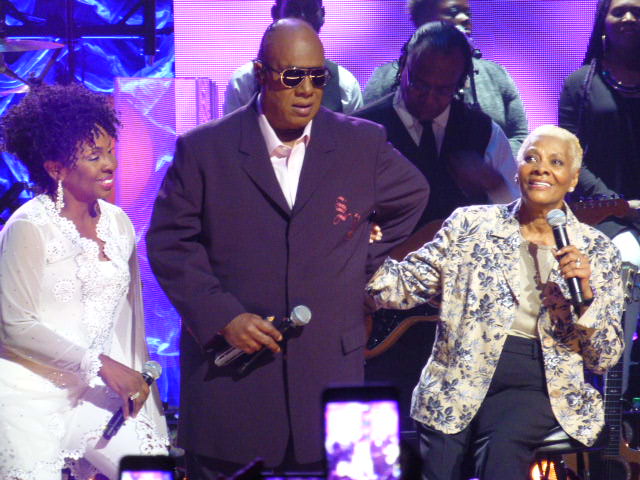 Backstage, Stevie hung out with Gladys — his Motown label mate in the 60s–and Dionne reminiscing about those early days. Stevie also told me about the heat– the actual temperatures– in Washington, Philadelphia, and Central Park as he performed three surprise shows on Monday to wild acclaim. He starts a new leg of “Songs in the Key of Life” tour next month, and he looks and sounds great.