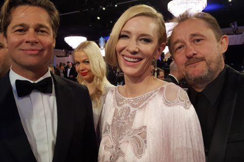 Another grouping involved Brad Pitt, Cate Blanchett, and her husband, theater director Andrew Upton. Brad and Cate co-starred in “Babel,” a few years ago, and were very happy to see each other — as evidenced by this photo I organized. Pitt was there because his company produced “The Big Short,” after having an Oscar hit with “12 Years a Slave.” When I offered that he was on a roll as a producer, he replied: “And we’ve got more coming!”