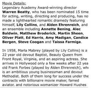 Fox will release this film later this year, starring Lily Collins, Alden Ehrenreich, and Beatty with a big supporting cast. As I wrote this week, Beatty doesn’t want to go to film festivals, so this may be how they test the film in advance. I have a good feeling about this one. Fingers crossed. Any members of the test audience can email me, confidentially, at showbiz411@gmail.com.
