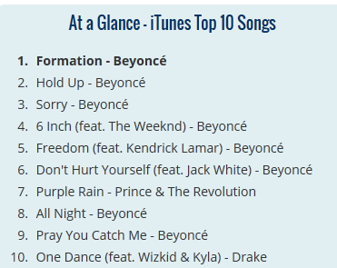The “Lemonade” album finally hit number 1, succeeding Prince’s greatest hits. But Prince still has a bunch of albums in the top 20. And a a dozen or so single tracks.