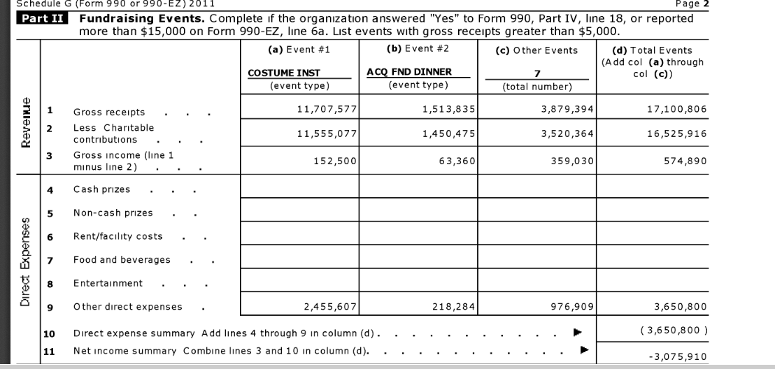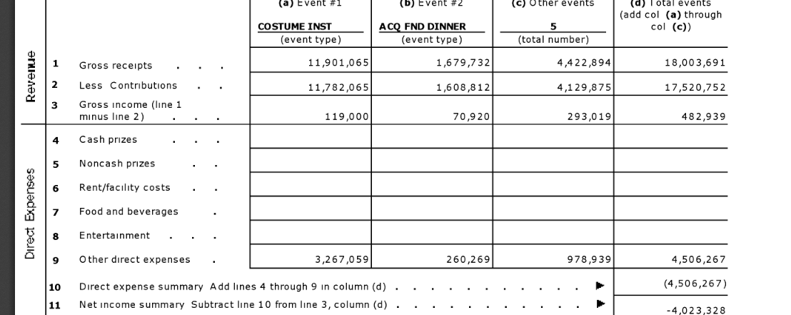For 2013, the Museum had seven fundraisers altogether. The total direct expenses were just over $4 million. Almost all of it was attributed to the Met Ball.