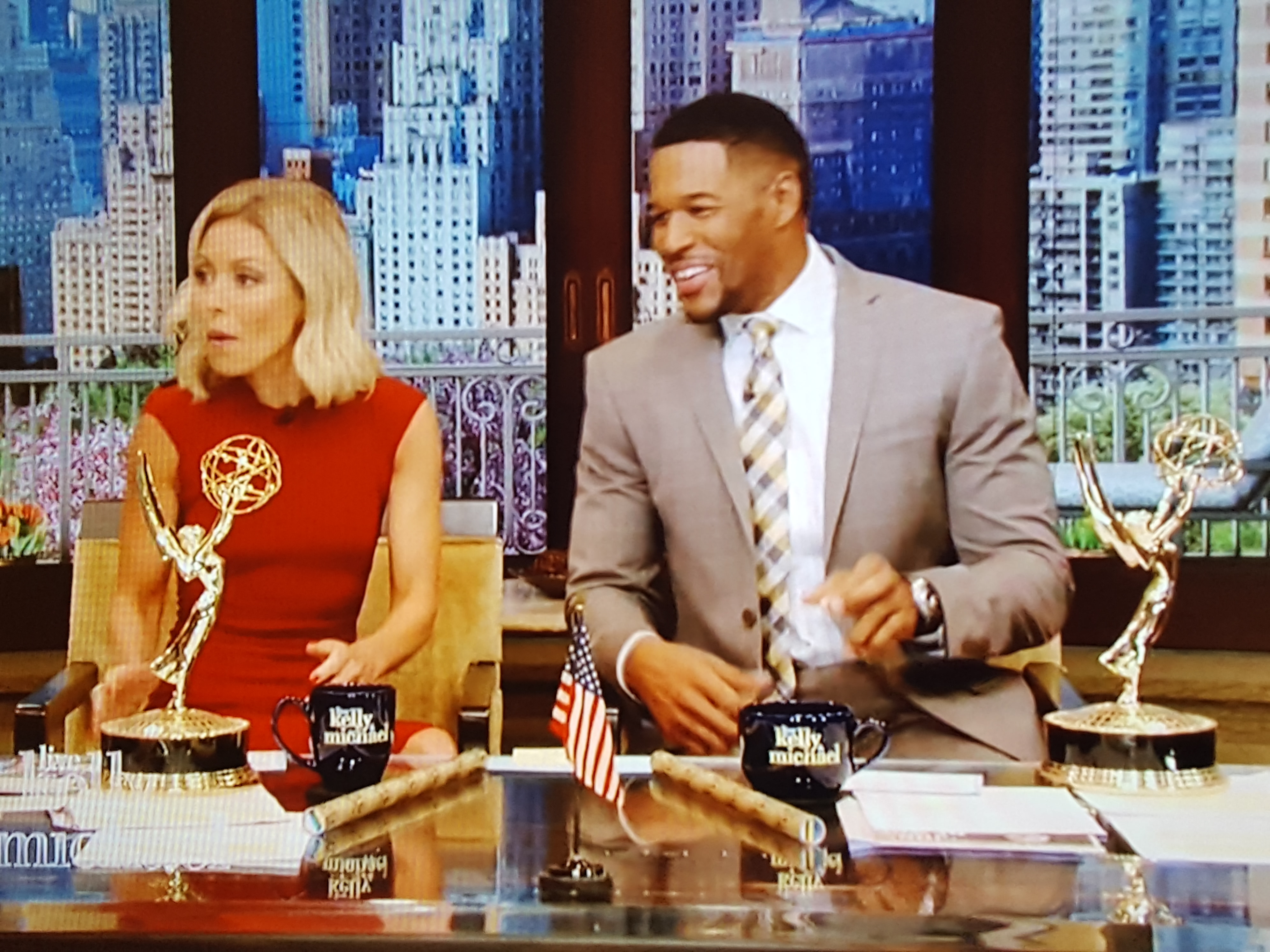 This morning Kelly and Michael Strahan are on their “Live” show, thank everyone for the Emmy Award they won last night at the Daytime Emmys. It’s ironic since Strahan is leaving in ten days, and Ripa is barely speaking to him.