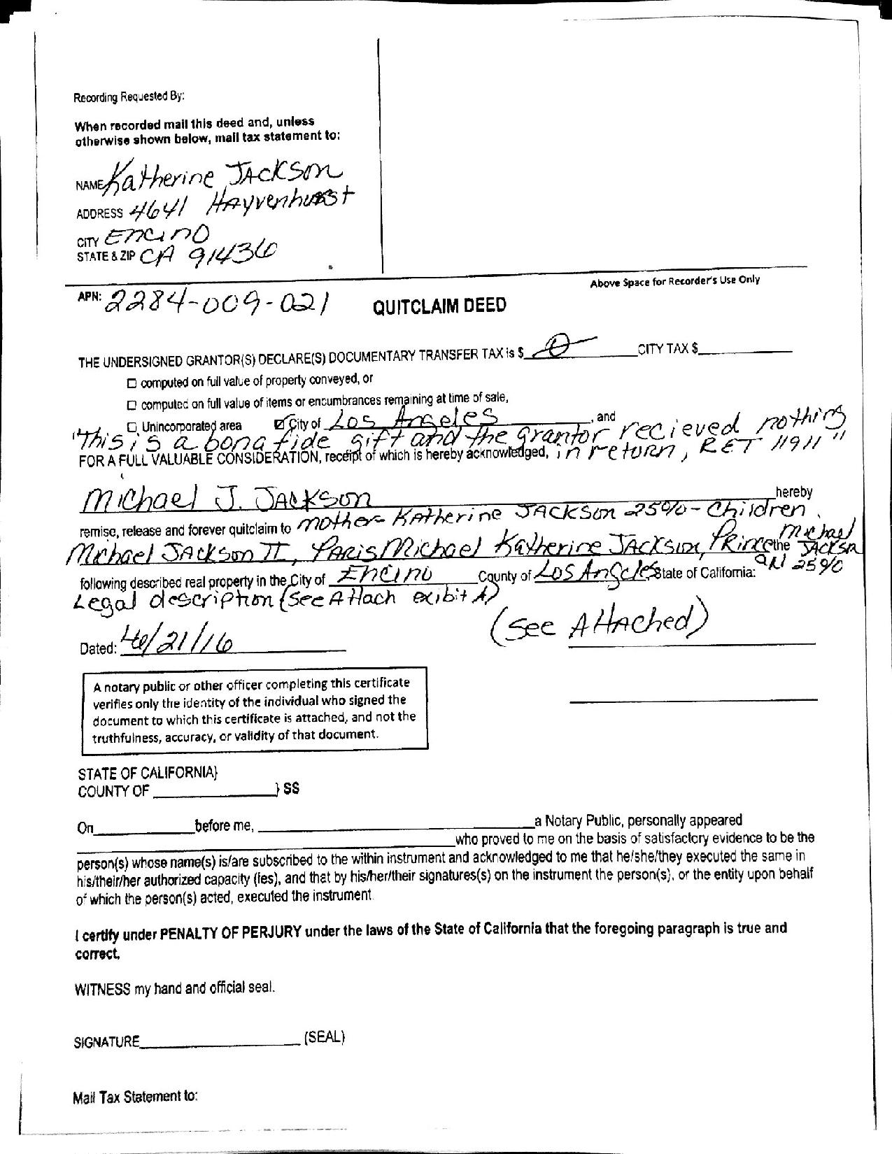 Papers were recently discovered with her “signature” in which Michael Jackson’s mother was seen signing away the rights to her old home in Encino, California. Mrs. Jackson hasn’t lived there for years, but the house– a walled compound– still exists on Hayvenhurst Avenue.