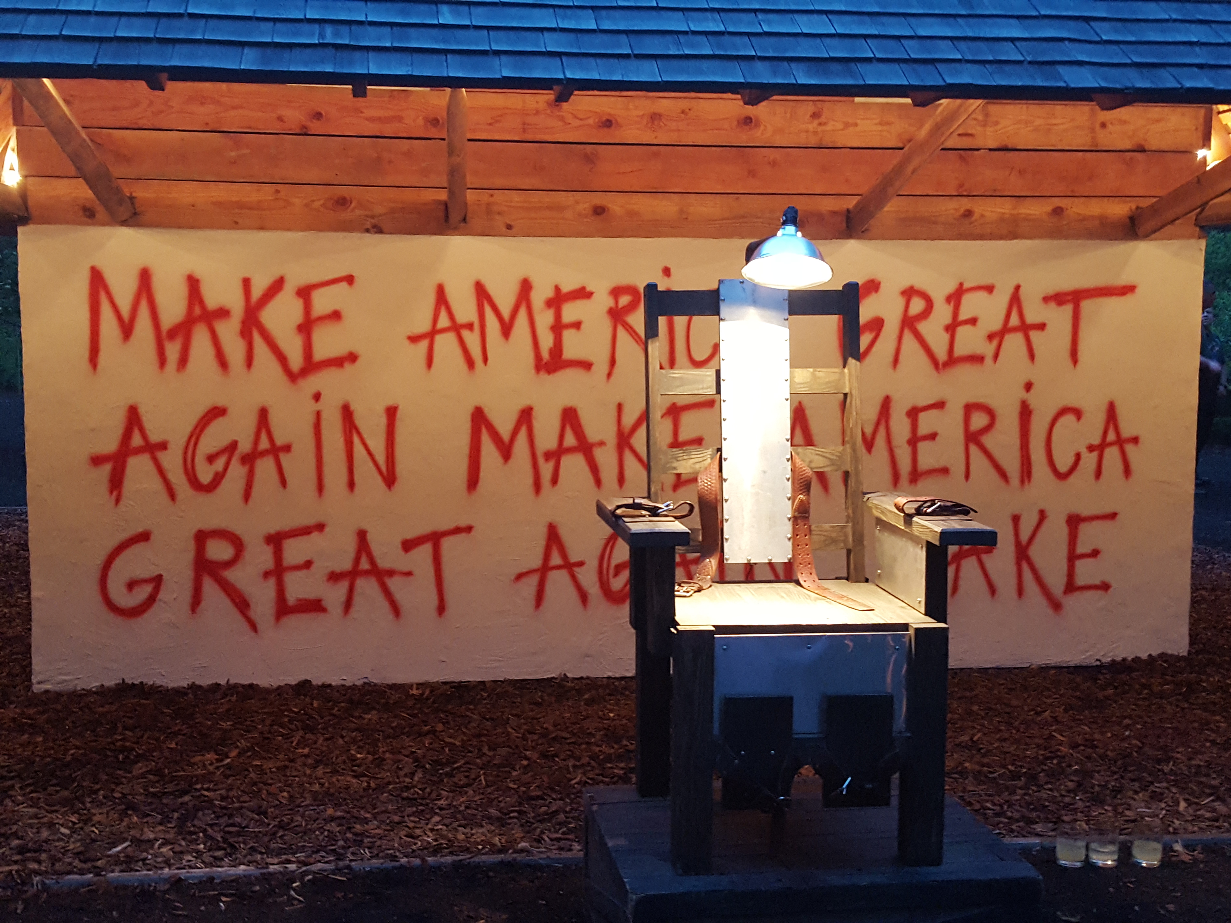 Over at the Watermill Center we met the famed artist and director Robert Wilson, who never fails to put on a stunning outdoor show– even in 100% humidity. Artist Hunt Slonem, one of our favorite people, was dressed like a couch from the 1950s– only artists can get away with that. Jay McInerney, who had a bestseller in 1984 called Bright Lights, Big City wore blue camouflage pants. If you’re in the Hamptons, the Watermill Center is a must see place, just like Longhouse Reserve. The Hamptons are full of surprises. I took this photo of Pussy Riot’s anti-Trump installation on the grounds. Some people sat in the electric chair. We declined.