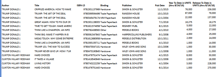 More surprising: When Trump’s book was retitled and reissued in paperback on July 1st, it was a bust. “Great Again” has sold 16,275 copies in trade (oversize) paperback.