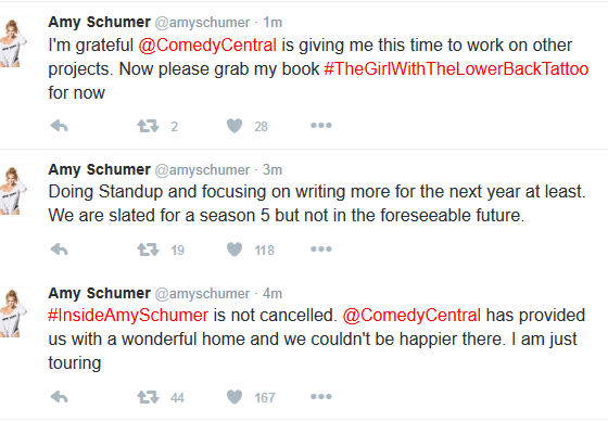 Amy Schumer’s “Inside Amy Schumer” is on indefinite hold. Schumer says the show is not cancelled, but “Doing Standup and focusing on writing more for the next year at least. We are slated for a season 5 but not in the foreseeable future.”