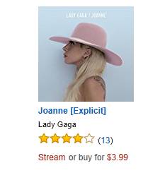 Well, at least I’ve helped. Last night I downloaded the iTunes version for $11.99, thinking there was no Amazon download. Now I’ve added the $3.99 version. You know what? It was worth it. “Joanne” is just great. Lady Gaga’s fans had better buy tons of these albums. And I hope radio gets on some of these songs. They’re hits. (I really love “Just Another Day.”) This could be Gaga’s “Goodbye Yellow Brick Road.” It’s that good.