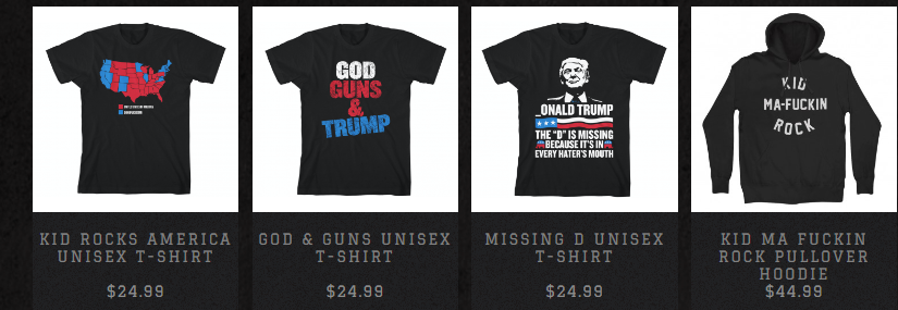 Kid Rock is now selling obnoxious, vulgar t shirts and merchandise on his website that are pro-Trump, anti-Blue State. One T shirt calls blue states “Dumbfuckistan.” Another: “God Guns Trump.”