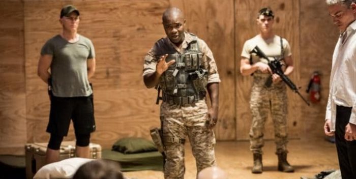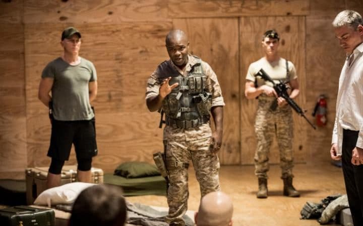 It’s a muscular, athletic production. Everyone in the cast with the exception of Rachel Brosnahan (Desdemona) looks like they’ve been to Barry’s Boot camp. Gold has turned Othello’s followers into soldiers of fortune. But their battles, while in their heads, are also played out on a plain stage strewn with mattresses and machine guns. There’s lots of humor, and a party scene (rivaling the one in “The Present” which I wrote about yesterday) where everyone joins in on Drake’s “Hotline Bling.”