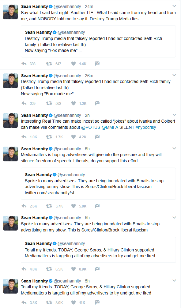 Sean Hannity– please stop it. What the heck is going on? You’re having a public meltdown. Get off the Seth Rich story and come back to planet Earth. Seriously, I worked with Sean at Fox News and I liked him. (Don’t shoot me!) I don’t agree with him, that’s different. But when this kind of Twitter stuff starts, it’s time to go to the mattresses (or something). Please, someone give this man a chocolate malted and tell him to calm down.