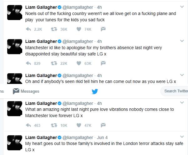 Wasn’t Ariana Grande’s Manchester concert filled with love? You bet. Except for Manchester’s own Liam Gallagher, half of the warring brothers from Oasis. There was some speculation that the Manchester tragedy would ignite an Oasis reunion between Liam and Noel. No such luck. Liam appeared with Chris Martin of Coldplay. Noel was nowhere to be found. And now thanks to Twitter we know how Liam felt about that. At least he’s consistent in his hatred of his brother. Oasis’s last actual hit was in 1996. PS Back then I actually witnessed these two brawling on the stage. They stopped a show. Good times!