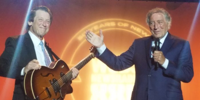 Tony Bennett, who just 91 years young, wowed the crowd last night at Newradio88 WCBS’s 50th anniversary at the Playstation Theater. And what a night! Tony finished off the program with aplomb, singing two songs. Before that he sat down with CBS’s Anthony Mason and told us who changed his name from Anthony Dominic Benedetto–nother than Bob Hope! “He said that’s no good, how about Tony Bennett?”