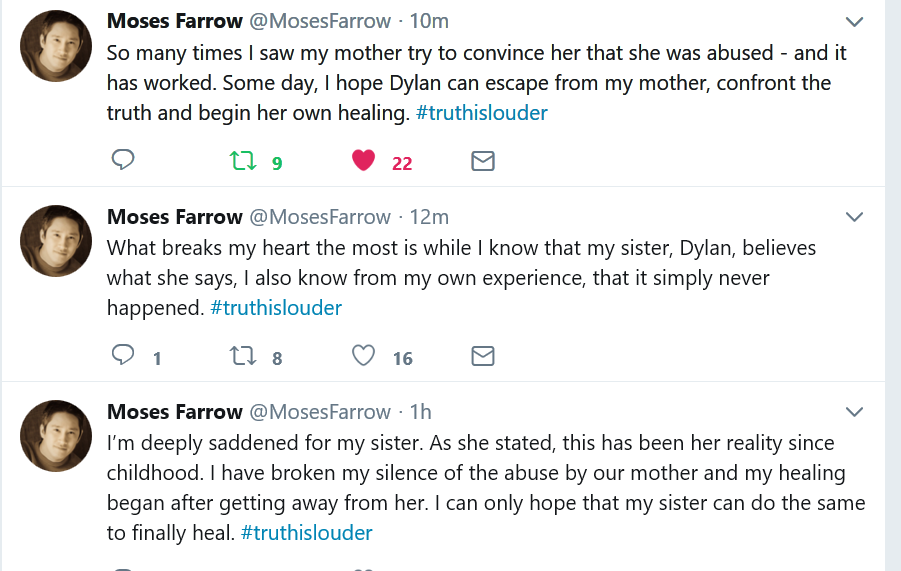 Moses Farrow has Tweeted out his response to sister Dylan’s accusations against their adopted father, Woody Allen.