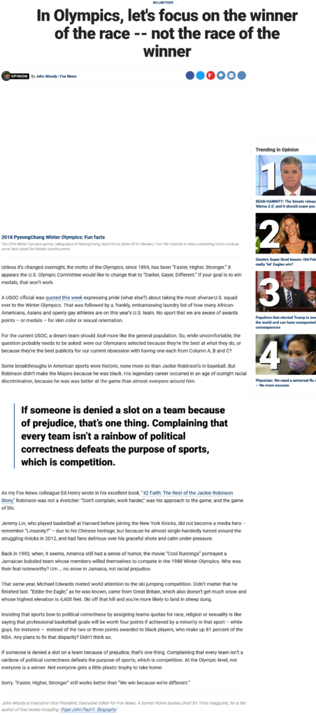 If someone is denied a slot on a team because of prejudice, that’s one thing. Complaining that every team isn’t a rainbow of political correctness defeats the purpose of sports, which is competition. At the Olympic level, not everyone is a winner. Not everyone gets a little plastic trophy to take home.