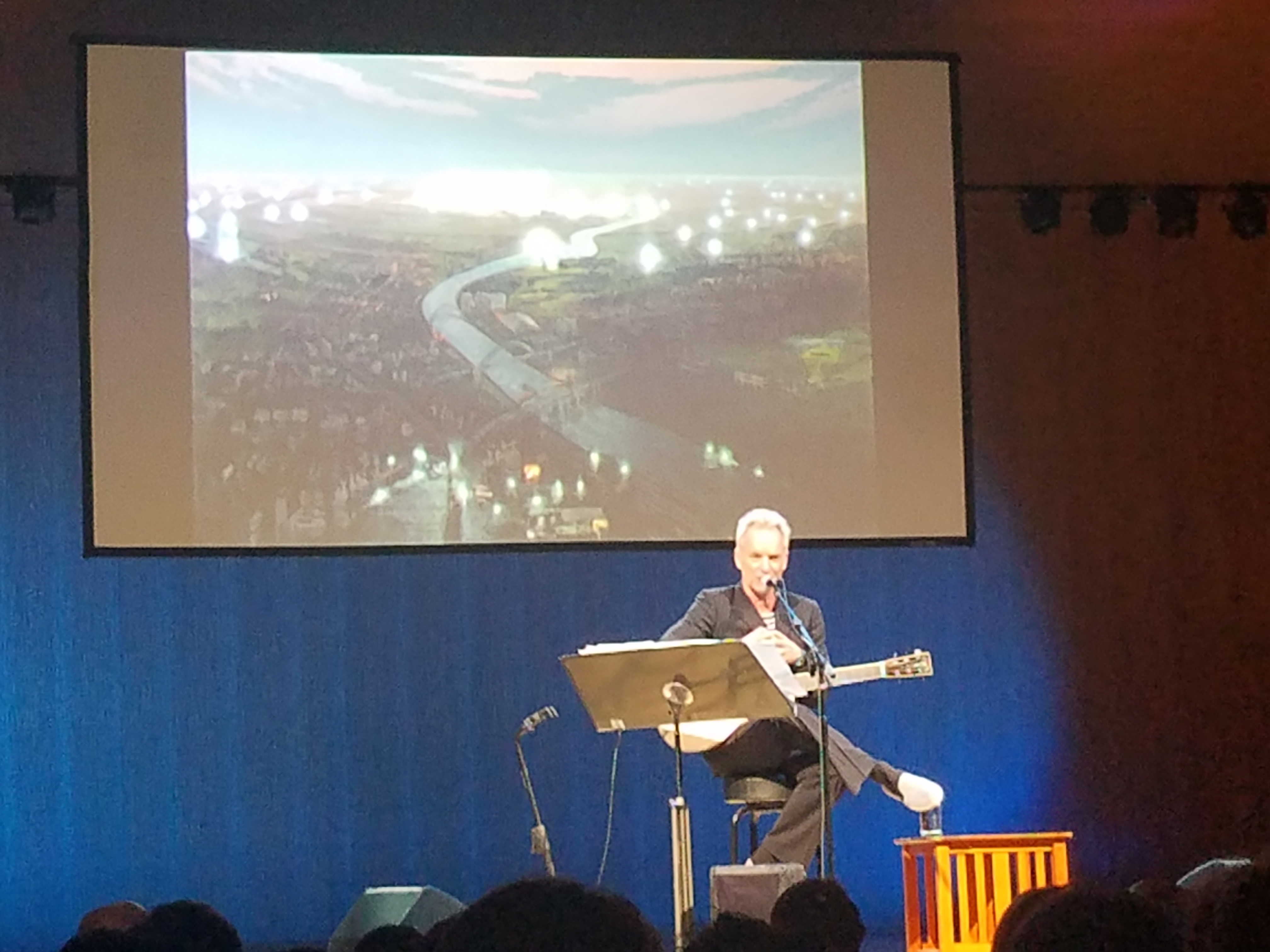 So why not fulfill another commitment? On Tuesday, Wednesday, and last night the rock superstar played an intimate acoustic 45 minute set at the Grace Rainey Rogers Auditorium inside the Metropolitan Museum of Art in conjunction with their Thomas Cole-Hudson River School exhibition. Needless to say, the three shows — called “Atlantic Crossing” — were sold out (the room holds about 650) and the audiences were swooning. They heard selections from Sting’s musical “The Last Ship” (currently a hit in the UK in a new streamlined version) with which he intertwined growing up in Newcastle, England among shipbuilders.