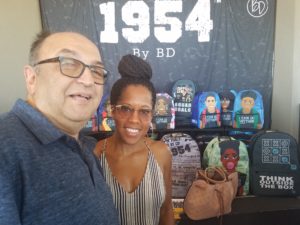 Regina spotted them and immediately fell in love with Casey Kelly. “I’m ordering 100,” she said, after deliberating with her business partner. “We’re going to give them away.” At $45 the price point is right. Also, Kelly’s features the year 1954 on everything– it’s the year of Brown vs. the Board of Education, when integration was ordered into public schools. Her more adult backpacks include one covered in newspaper clips of that momentous decision.