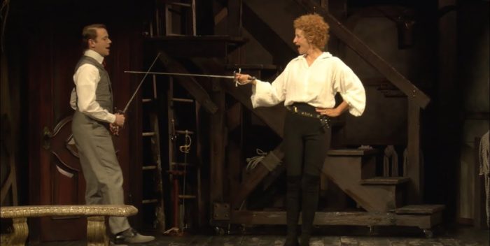 Rebeck gives a bang for your buck. Not only do we get her new play of Bernhardt trying to stage her “Hamlet,” we all get the famous chunks of Shakespeare’s play as Bernhardt (McTeer) rehearses it. In Act Two, we get sections of “Cyrano,” because as Rostand is sleeping with Bernhardt and re-writing “Hamlet” for her (it didn’t work, he was replaced), he is also staging his famous work–dedicating Roxane to Bernhardt.
