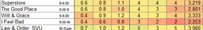 But CBS is golden compared to NBC. What the heck is happening? Look at these ratings. They’re lower than “The Young and the Restless.” Actually, NBC’s own “Days of our Lives” doing better at noon by comparison. Very few people are watching the NBC lineup even though it’s hip and cool and all that. Maybe it’s a promotional problem. But these numbers are Must Not See TV. I thought “Will & Grace”: was a big hit. And “SVU” should be doing a lot better. It’s tough out there!