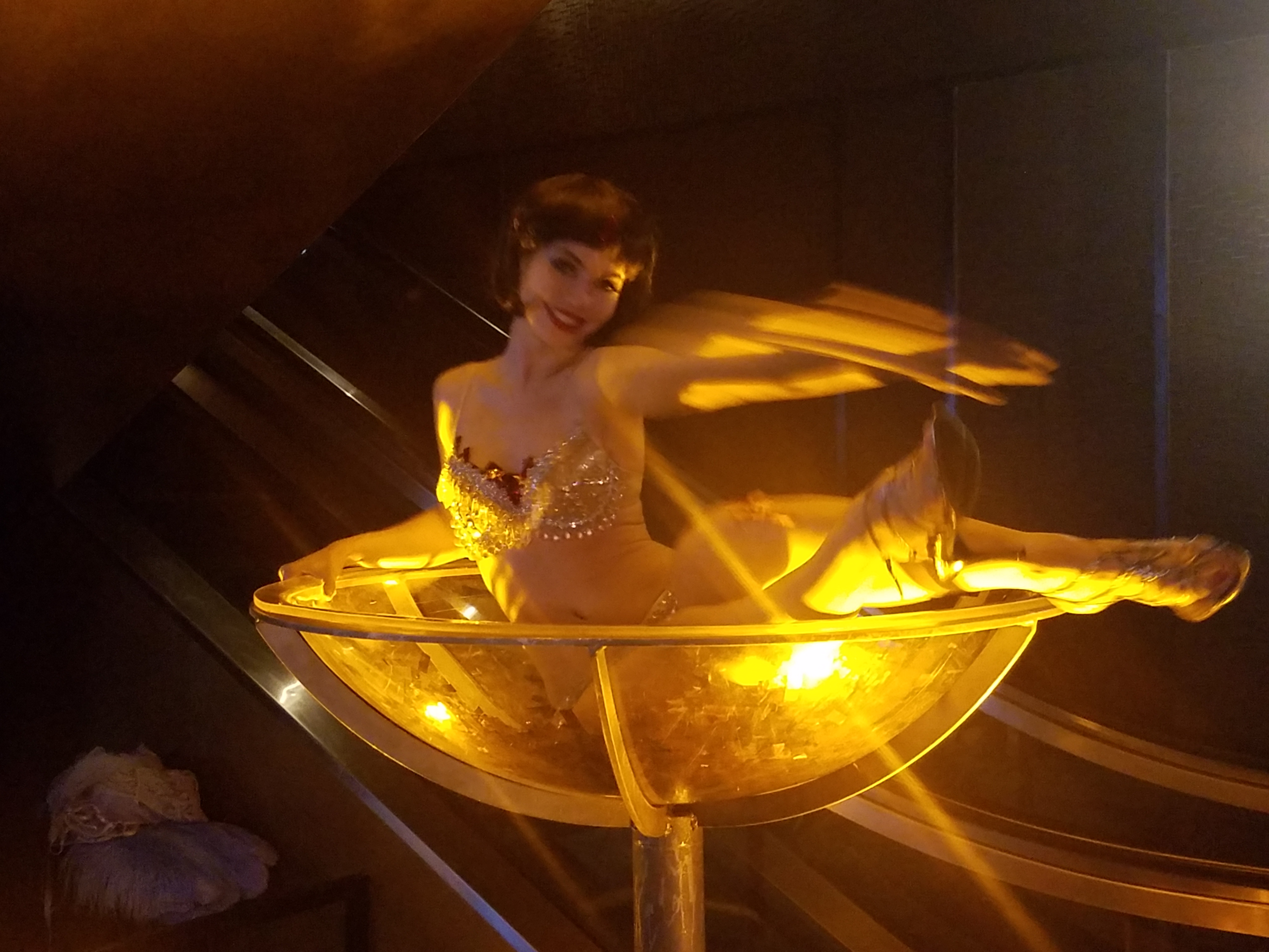Other celebs milled in the lobbies, nibbling on shrimp, steak, and fried cauliflower. In the basement lobby, there was a jazz band with a female lead singer dressed to look like it was the Copa in the 1950s. Beautiful young ladies, dressed scantily (but within parameters) fan-danced and gyrated in a five foot high martini glass. A Charlie Chaplin imitator toodled around in full Trump with a swing cane and a mustache.