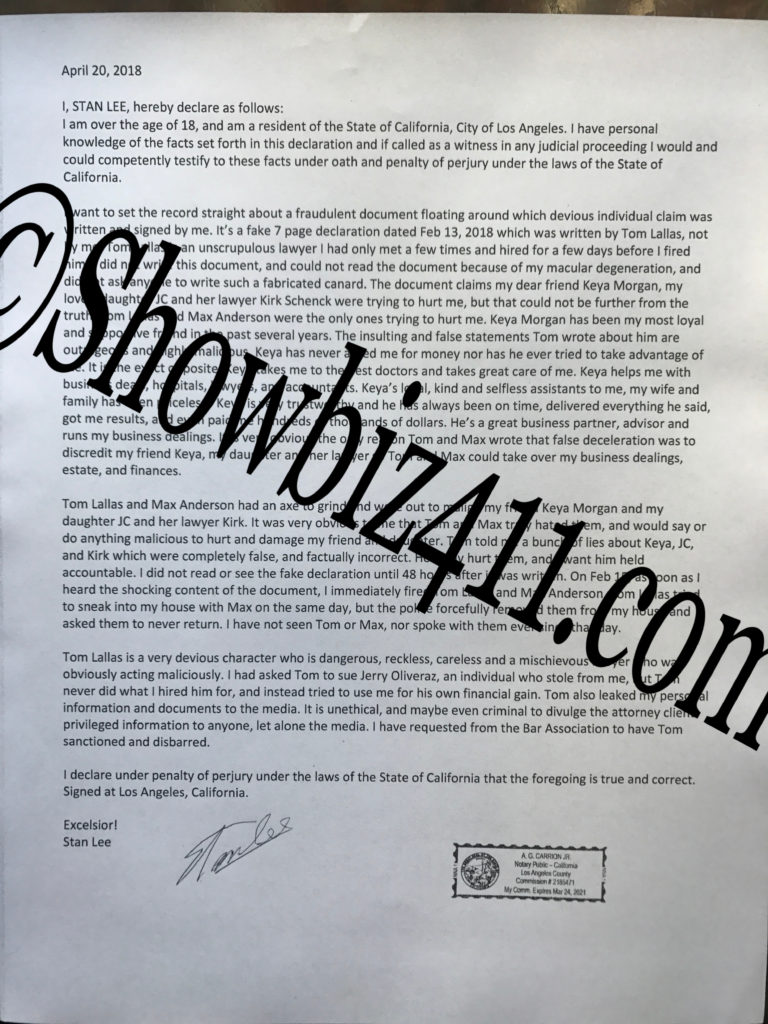 When Morgan was suddenly being accused of elder abuse in places like TMZ, he sent me a letter that Lee had written, and was notarized, from last June. Morgan may have helped Lee write it, but Stan signed it and it was properly recorded. In it, Stan says “Keya Morgan has been my most loyal and supportive friend in the last several years.”