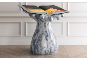 Wait: there’s a $5500 edition that comes on a gold tray. “”Drippy + The Brain,” the custom cast-resin tabletop bookstand (measures 57 x 43-1/2 inches | 1,450 x 1,105 mm ) created in collaboration with The Haas Brothers is plated in an 18-carat gold color with mirror-finish, topped with a cushioned platform made from high-density, laser-cut.” That one weighs 60 pounds, or as much as Rihanna on a diet day.
