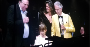 ANDREA BOCELLI was in New York recently for two sold out shows at Madison Square Garden. Among his backstage guests was Oscar winner Richard Dreyfuss. Bocelli’s conductor was none other than Stephen Mercurio, who guided Sting and his orchestra through “Symphonicities” and waved his baton for Aretha Franklin’s band three years ago in front of Pope Francis in Philadelphia. I was the proud guest of Steven Gaydos, executive editor of Variety who flew into New York to present Bocelli with its inaugural International Achievement in Music Award onstage. David Foster and wife Katherine McPhee (see below) were among Bocelli’s special performers. My front photo is the massive Bocelli orchestra and choir. And to the left, Gaydos — very Merv Griffin — presents Bocelli with his award. (The Academy should call him now to host the Oscars!)