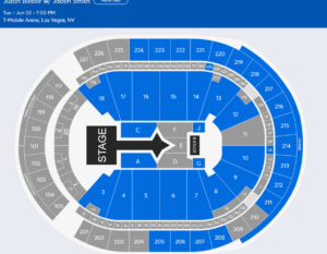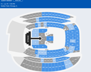 What’s happened? Bieber’s audience has finally grown up and moved on, at least in the US. This is very alarming for his concert tour, which begins on May 14th in Seattle and proceeds through America’s heartland through the summer. For every show on Ticketmaster there are huge chunks of seats unsold so far. The blue areas below are all for sale including, as you can see, floor seats and those expensive premium seats that include a Meet and Greet package with the Biebs.