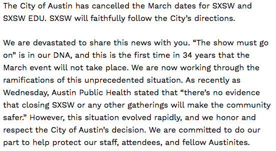 As recently as Wednesday, Austin Public Health stated that “there’s no evidence that closing SXSW or any other gatherings will make the community safer.” However, this situation evolved rapidly, and we honor and respect the City of Austin’s decision. We are committed to do our part to help protect our staff, attendees, and fellow Austinites.
