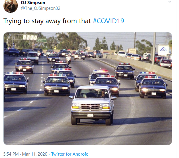 Held responsible by a civil jury for the deaths of two people, whose murders he stood trial for, Simpson has posted a joke about the coronavirus and his famous Bronco chase to Twitter. What kind of person is this? A person who murders his ex wife and her friend in cold blood? And then writes about in a confessional after he’s acquitted? Yes, he’s that person. His existence is infuriating. He should be in jail for the rest of his life.