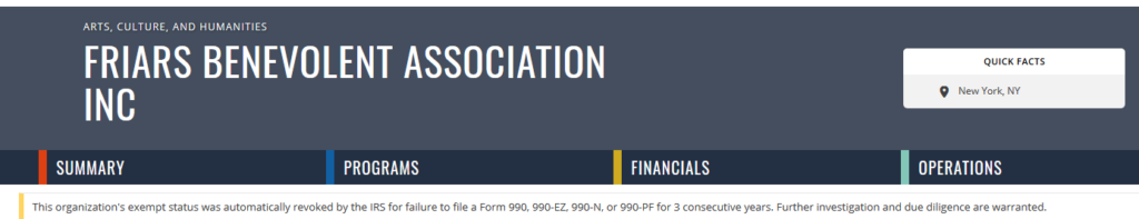 But without the 501 c(3) designation, the Friars are lost. On their Guidestar title page, you can find just this: “This organization’s exempt status was automatically revoked by the IRS for failure to file a Form 990, 990-EZ, 990-N, or 990-PF for 3 consecutive years. Further investigation and due diligence are warranted.” They’ve also been removed from Charity Navigator.