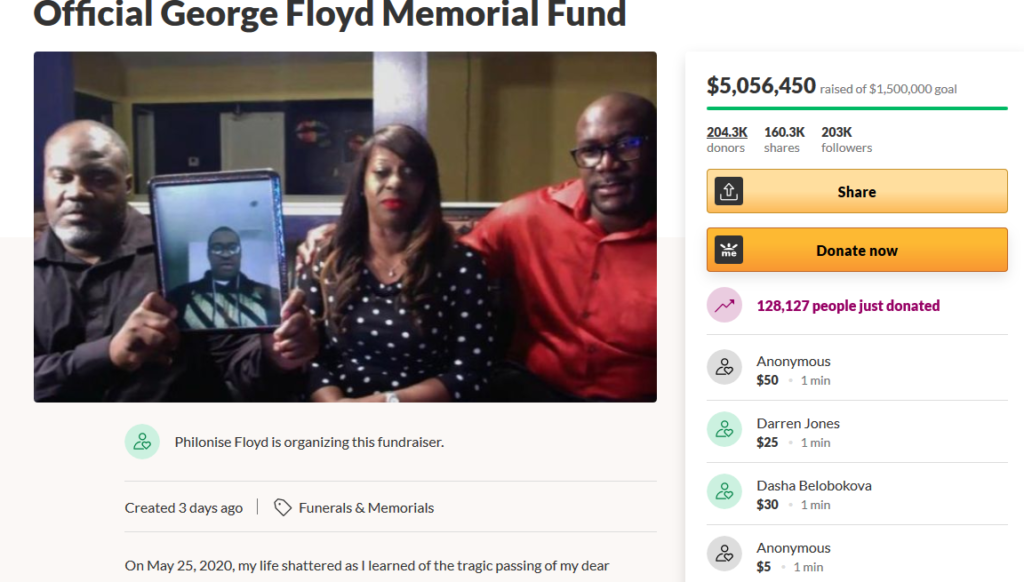 EARLIER The official GoFundMe page for George Floyd has raised an astonishing $5 million in just three days. The page is organized by George’s brother, Philonise, the same brother who reported that his conversation with Donald Trump was for naught. Philonise said that Trump did all the talking and didn’t listen to a word he said.;