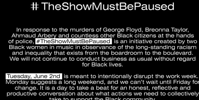 Two record execs from Atlantic Records, Brianna Agyemang and Jamila Thomas, came up with the plan for a Blackout Tuesday tomorrow, June 2nd. The entire music industry will stop and pause for reflection and involvement in community. Implicitly this in memory of George Floyd, and all victims of anti-black racism.