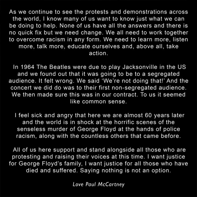Paul McCartney recalls below how the Beatles refused to play in front of a segregated audience back in the mid 60s. On Black Lives Matter, Paul says “I feel sick and angry about what happened to George Floyd.” You may recall that Paul’s song “Blackbird” was written as a song for racial equality. The only time the Beatles had a fifth member was Billy Preston, who played on “Get Back” and sessions for “Abbey Road” and “Let it Be.” And it was 38 years ago this week that Paul topped the charts with Stevie Wonder on “Ebony and Ivory,” a song that preached equality.