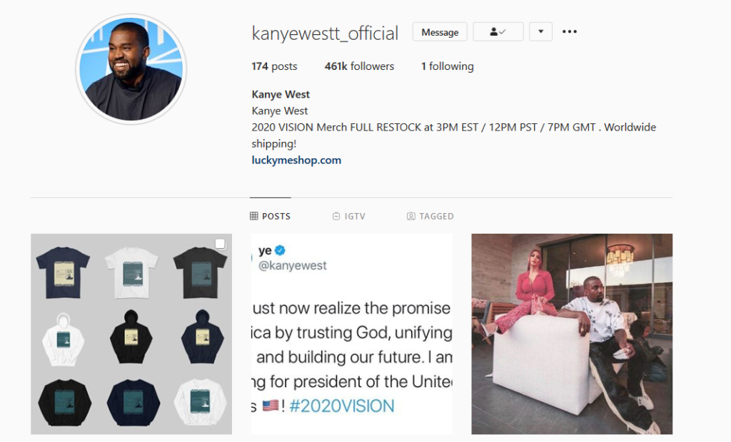 No, the next Instagram post from Kanye was for a sale this afternoon of his crappy merchandise. That’s what the Saturday proclamation was all about. Get rid of t shirts and other junk no one wants all labeled “2020 Vision.” Kanye’s vision is money.