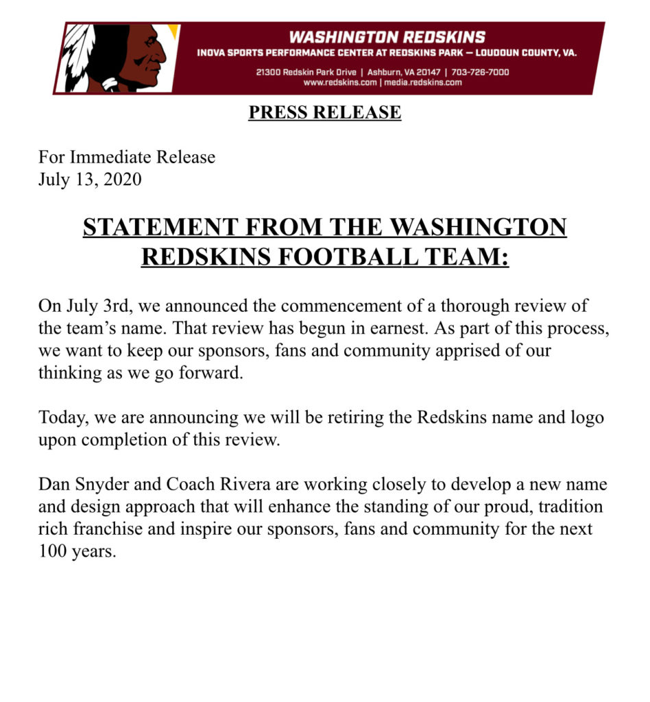 And so it is for the Washington Redskins. They announced they are dropping their racist name and logo this morning. The press release came on stationery featuring… their racist name and logo.