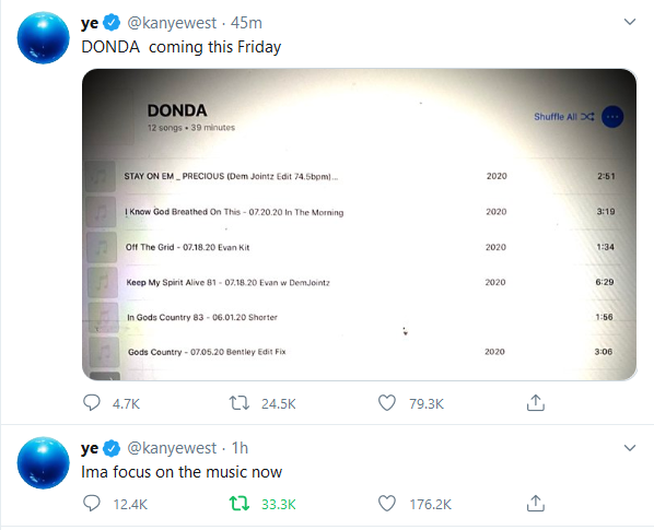 Then he tweeted the tracklist for his new album, called “Donda,” named for his mother. It drops on Friday.