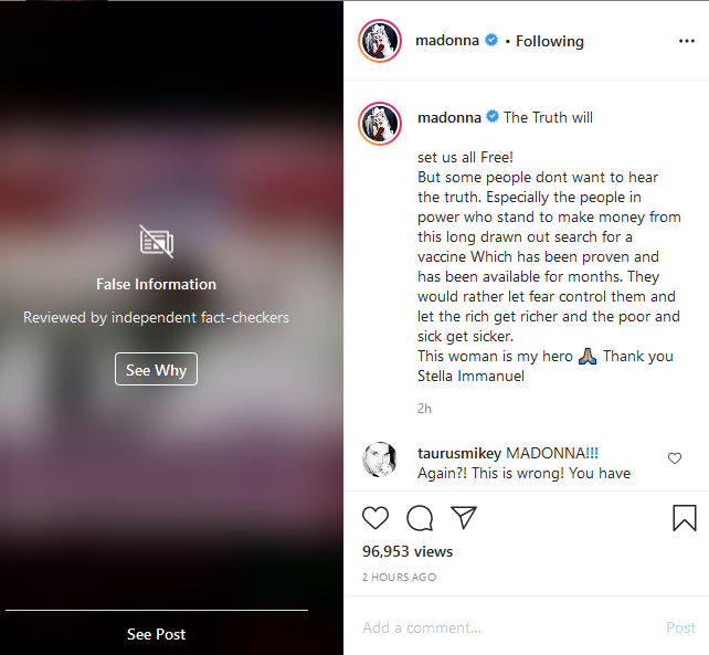 Instagram censored the post as mis or disinformation, and referred readers to the truth about Hydrochloroquin, which does not cure COVID-19.