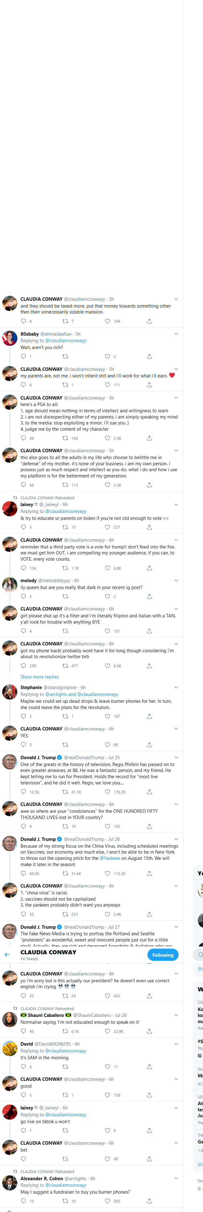 Claudia Conway, the beautiful and smart 15 year old daughter of Trump mouthpiece Kellyanne Conway and estranged husband George Conway, is back on Twitter. Or at least she was at 3am. Claudia, a rebel with a cause, rejoined the fray with a bang in the middle of the night for the first time since her parents grabbed her phone on July 13th.