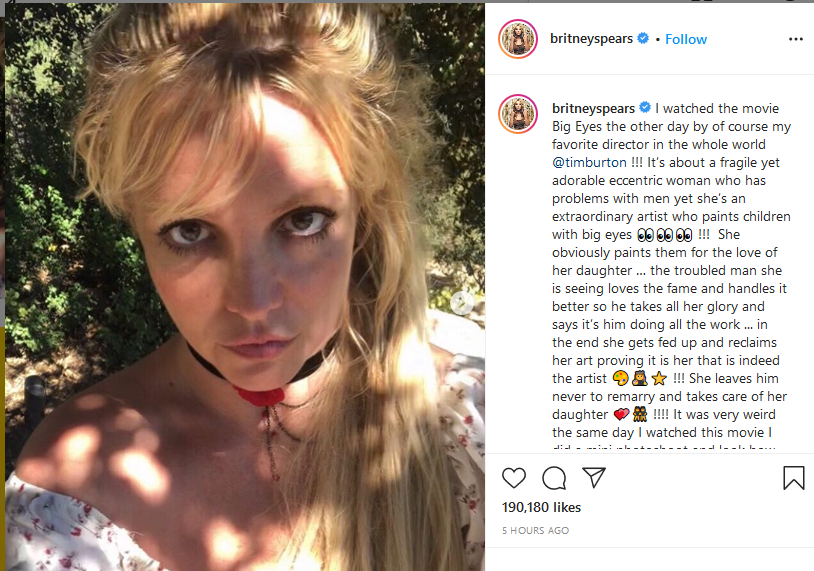 Britney Spears has chosen Tim Burton’s “Big Eyes” as her favorite movie. She’s posted a review to Instagram: